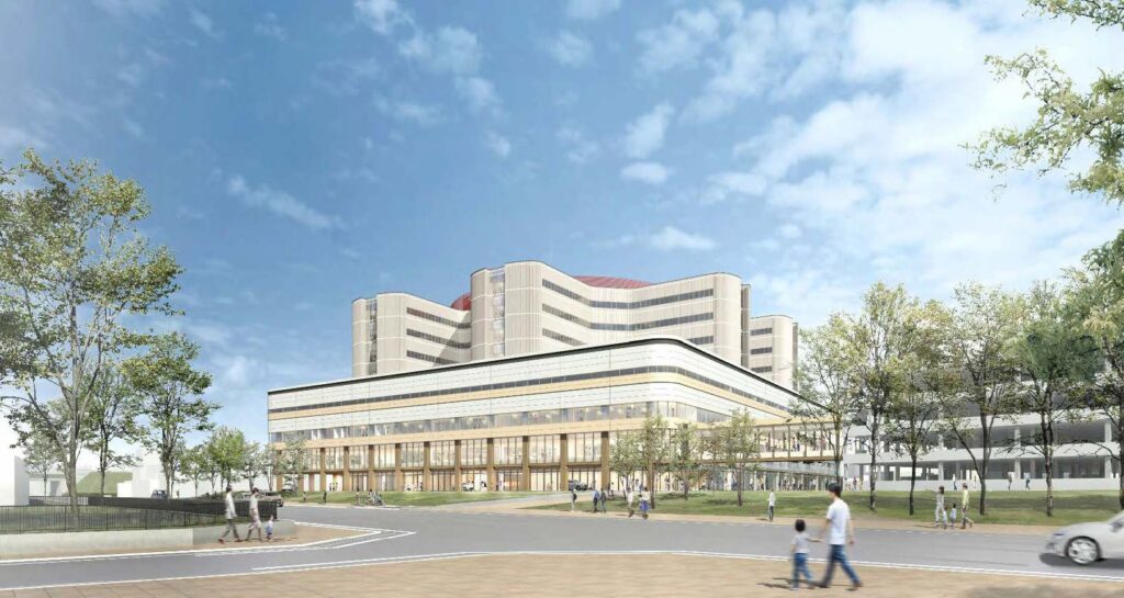 病床については、一般病床を計画の751床から701床に削減し、総病床数を707床(一般701床〈うち被ばく疾病者対応病床1床)、感染症病床6床)とする。また、病棟は、井形構造とし、1フロアに4病棟を配置する。基本設計は佐藤総合計画・八洲建築設計事務所JVが担当している。