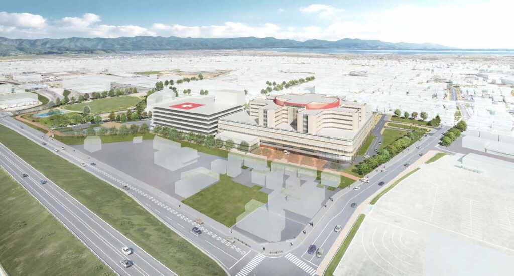 現在の計画は、病床70床、建物は免震構造のRC造り3階建て延べ5755㎡を予定し、2026年4月着工、28年5月開院を目指している。