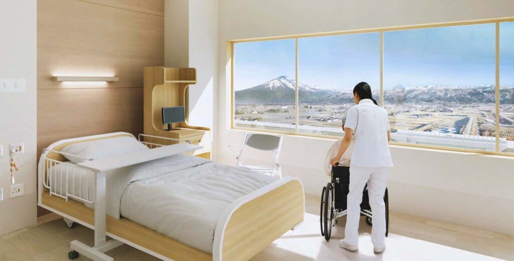同病院は、1952年に町立鏡野病院として開院し、1963年に移転開設、1989年に現在地に新築移転して以降、鏡野町の入院・外来機能および救急告示病院、へき地医療拠点病院として地域の医療を守る役割を担ってきたが、新築移転後30年以上経過し、医療需要に応じた増築、大規模改修を繰り返してきた施設は療養環境の狭あい化、老朽化の進行、自然災害による水害等の対策、さらには新興感染症の感染拡大時に備える整備も必要となっている。