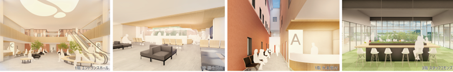 左から1階エントランスホール、総合待合、外来受付、3階スタッフコモンズ(基本設計時点)