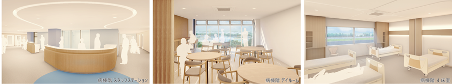 左から病棟階スタッフステーション、病棟階デイルーム、病棟階4床室(基本設計時点)
