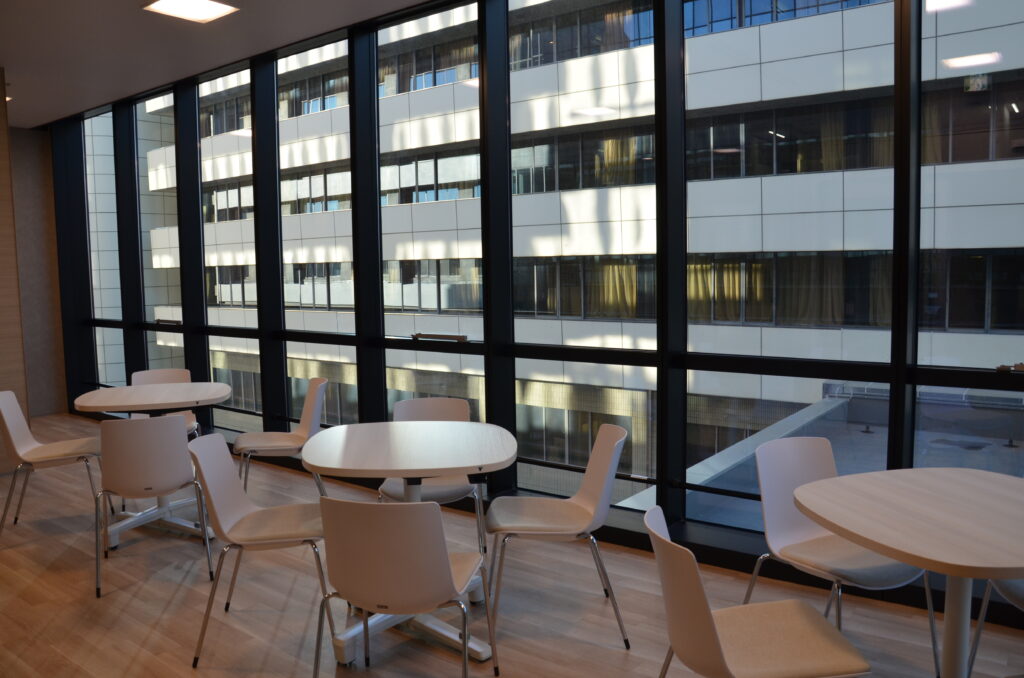 ④については、例えば病棟においては、各階の2病棟の各SSの三方に病室を配置し、スタッフの病室の見通しを確保し、また、患者動線となる廊下と、2つのSSを結ぶスタッフ通路を確保するとともに、カンファレンスや休憩スペースとなるスタッフラウンジを1か所設けた。小児病棟の病室扉などに画家が描いた動物の絵などホスピタルアートを施した。病室やデイルームは広い面積の窓を採用し、ワイドな眺望を確保し開放感を高めた。